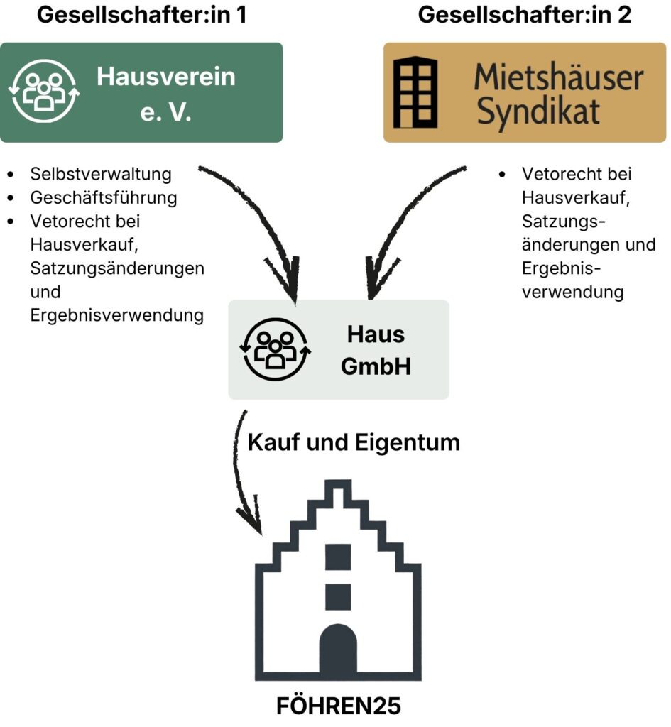 Zentraler Akteur wird die Haus GmbH. Diese erwirbt das Objekt und wird Eigentümer:in. Die Haus GmbH wird zwei Gesellschafter:innen haben, den Hausverein e. V. und das Mietshäuser Syndikat.